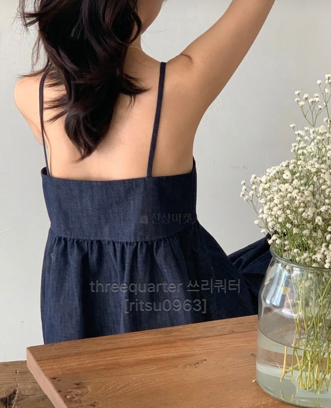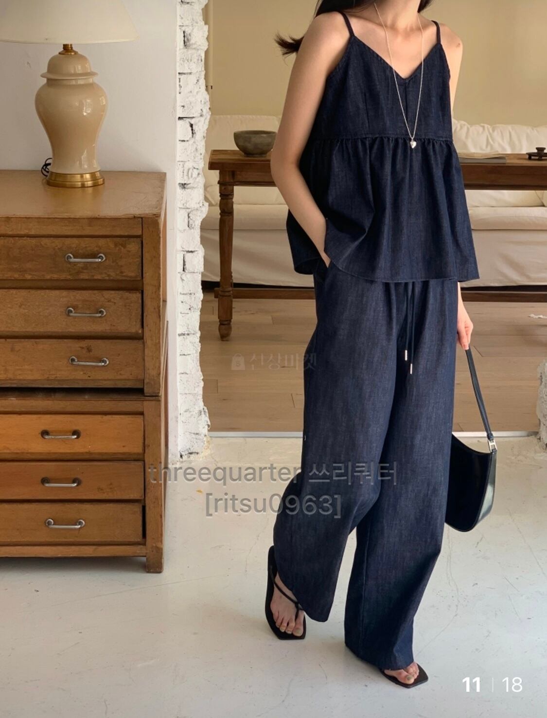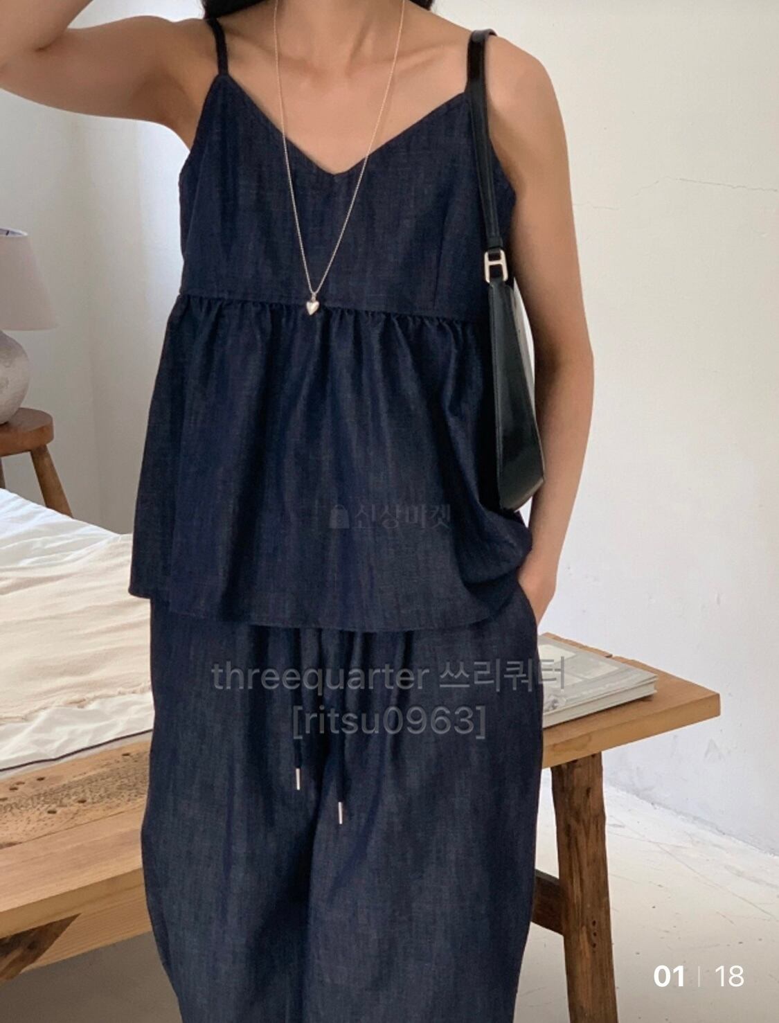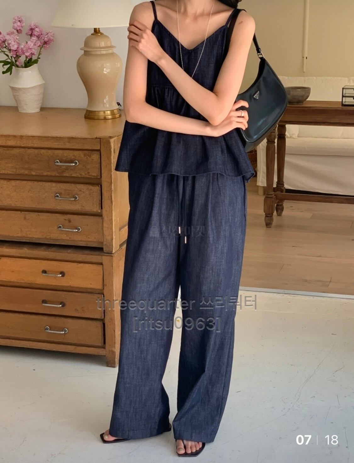 デニム素材のキャミソールとパンツのセットアップ。