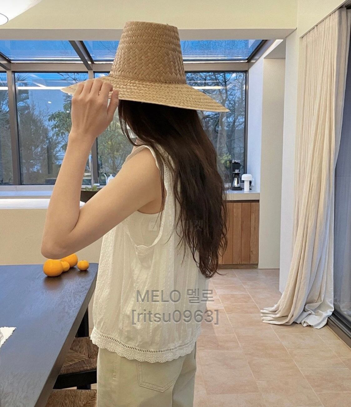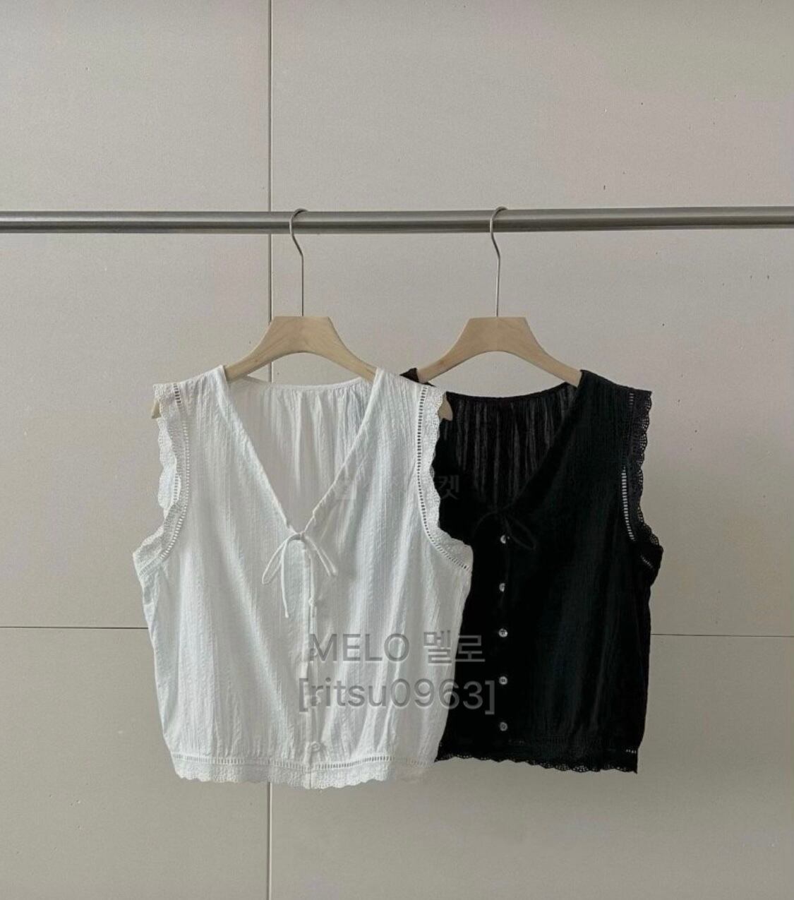 腕周りと裾部分にレースをあしらったノースリーブ のブラウスです。